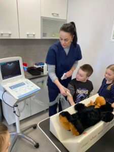 Dzieci bliżej poznały zawód weterynarza oraz groomera. Mogły zobaczyć jak wygląda przychodnia weterynaryjna „od zaplecza”, poćwiczyć zakładanie opatrunku na maskotce z „Psiego Patrolu”, zrobić prawdziwe USG, a także miały niezwykłą okazję – dawać smaczki, czesać oraz głaskać, a nawet przytulić się do uroczej i niezwykle łagodnej 70 kilogramowej Yumi.