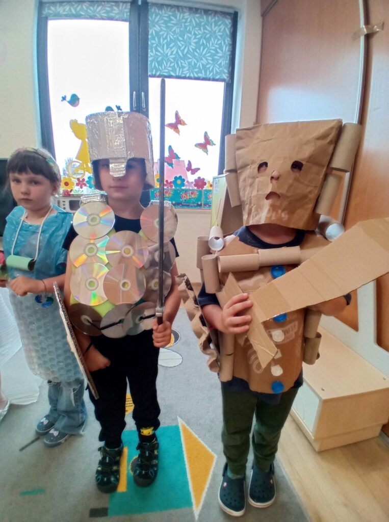 Rodzice wykazali się niesamowitą kreatywnością 🎨✂️ – stroje z kartonów 📦, folii bąbelkowej 🫧, rolek po papierze 🧻 i nakrętek ⚙️ wyglądały jak z ekologicznego fashion weeku! W ten sposób dziś świętowaliśmy Dzień Ziemi!